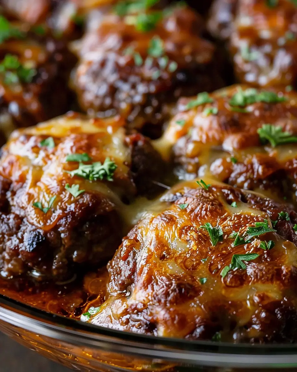 Spread the soup evenly over the patties to create a luscious sauce that seeps into the beef during baking.