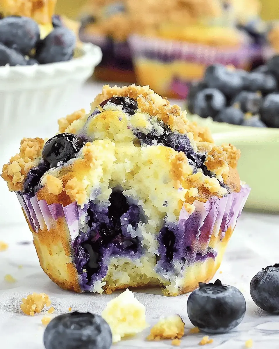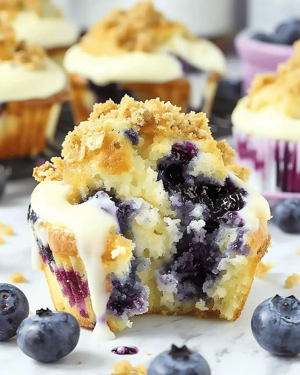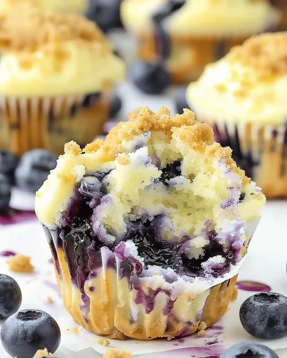 Deliciously moist muffins filled with a rich cheesecake center and bursting with fresh blueberries.