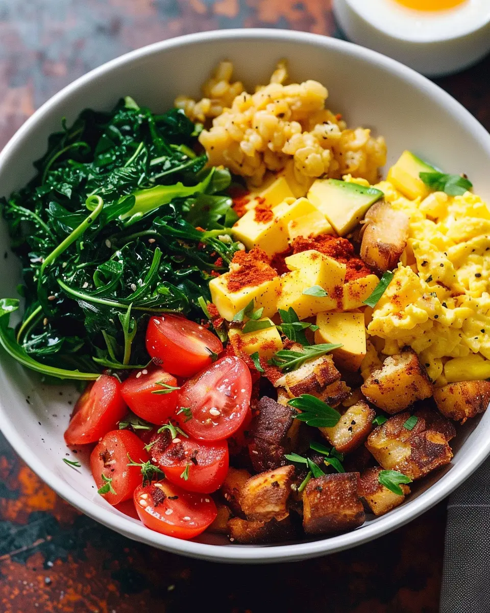 One of the best things about a breakfast scramble bowl is its versatility. If you’re looking to pack in more nutrients without the meat, consider loading yours with a vibrant mix of vegetables. Think sautéed spinach, bell peppers, cherry tomatoes, or even some roasted sweet potato for a hint of sweetness.