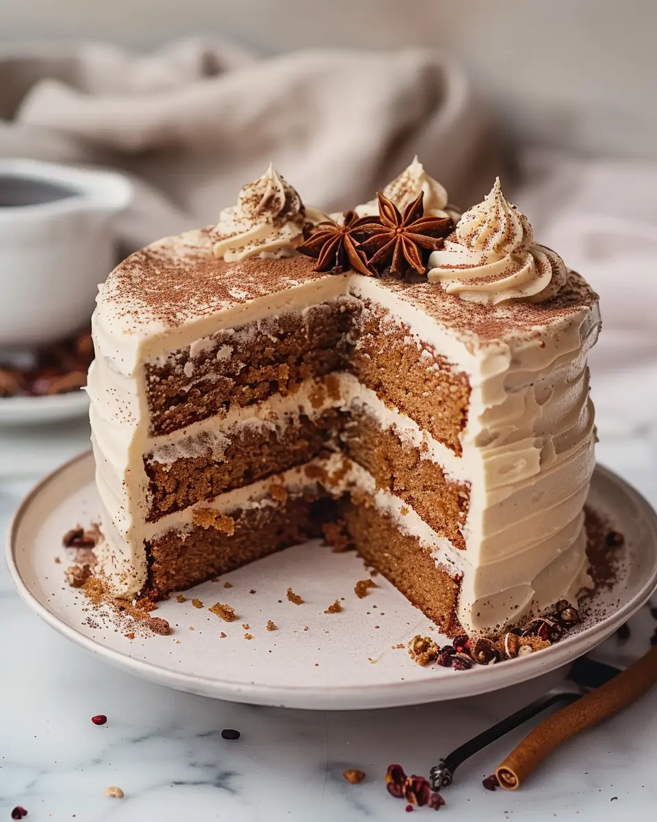 A warm and flavorful chai cake topped with rich brown butter cream cheese frosting, perfect for any cozy gathering.