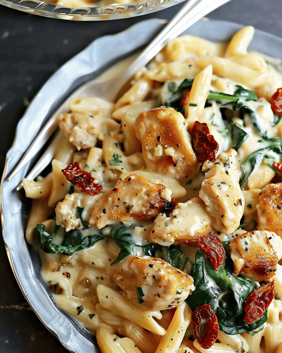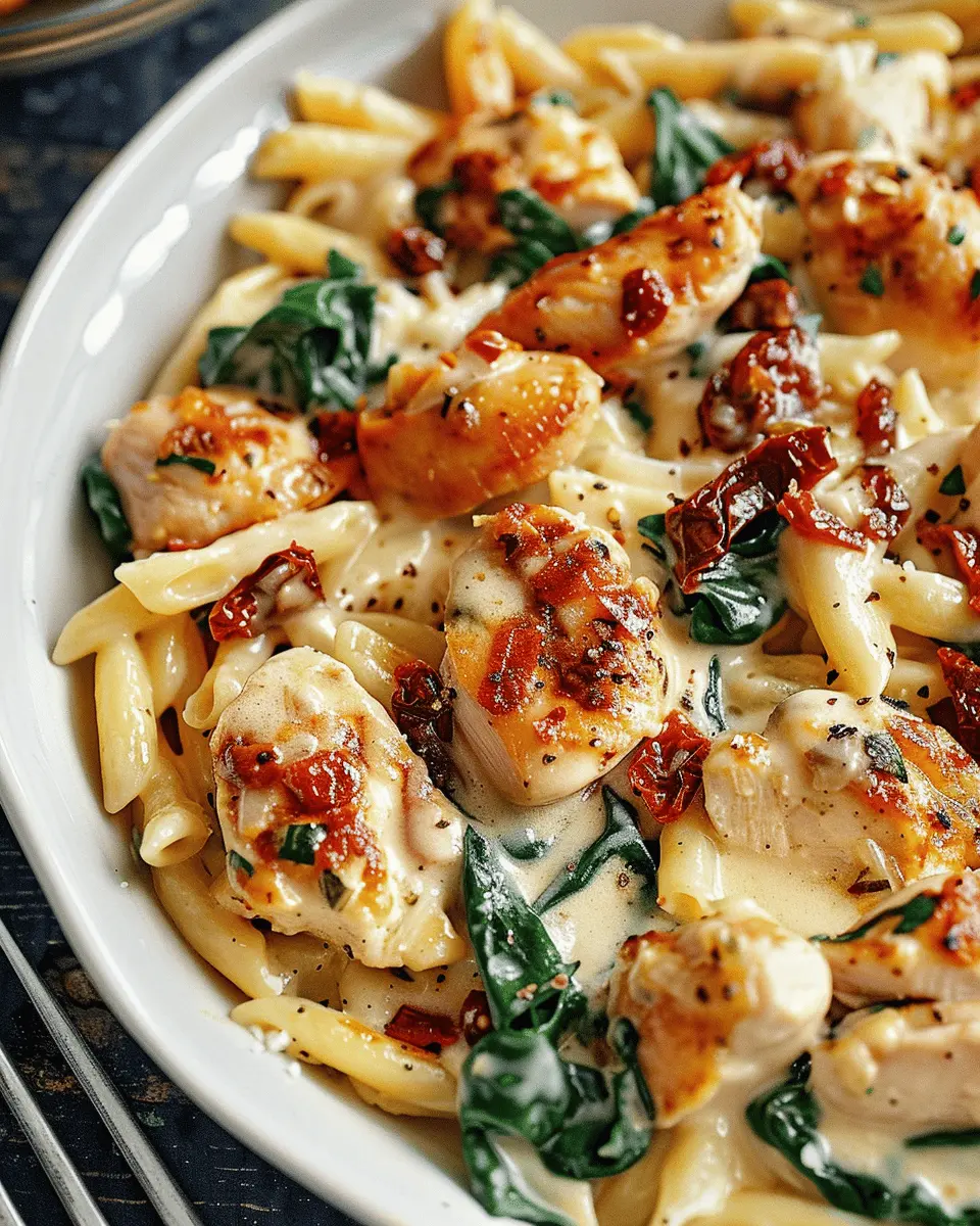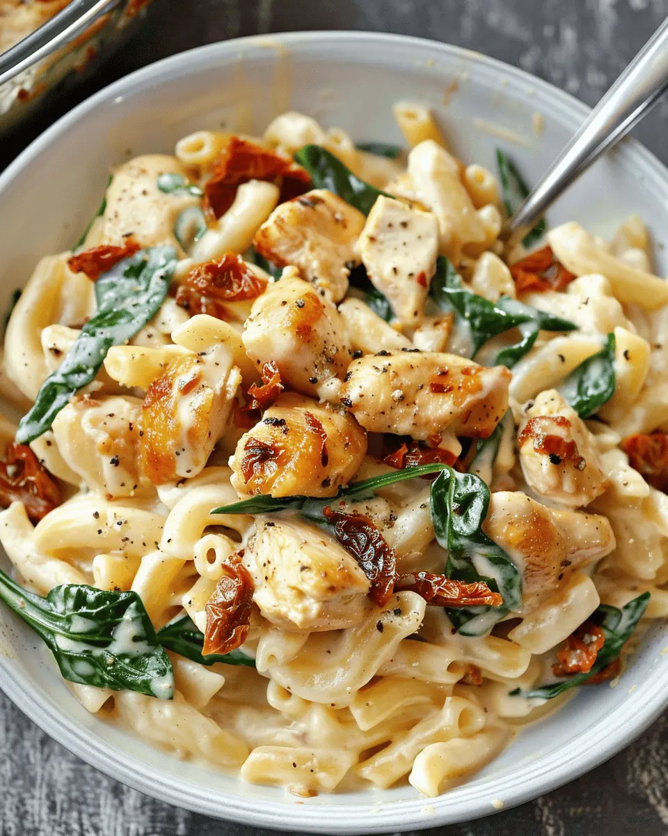 Imagine tossing the cooked pasta in a luscious, creamy Alfredo sauce, then folding in tender pieces of chicken, vibrant spinach, and sweet, chewy sun-dried tomatoes. Not only is it visually pleasing, but each forkful is a harmony of flavors. For an extra kick, consider adding a dash of lemon juice or some freshly cracked black pepper.