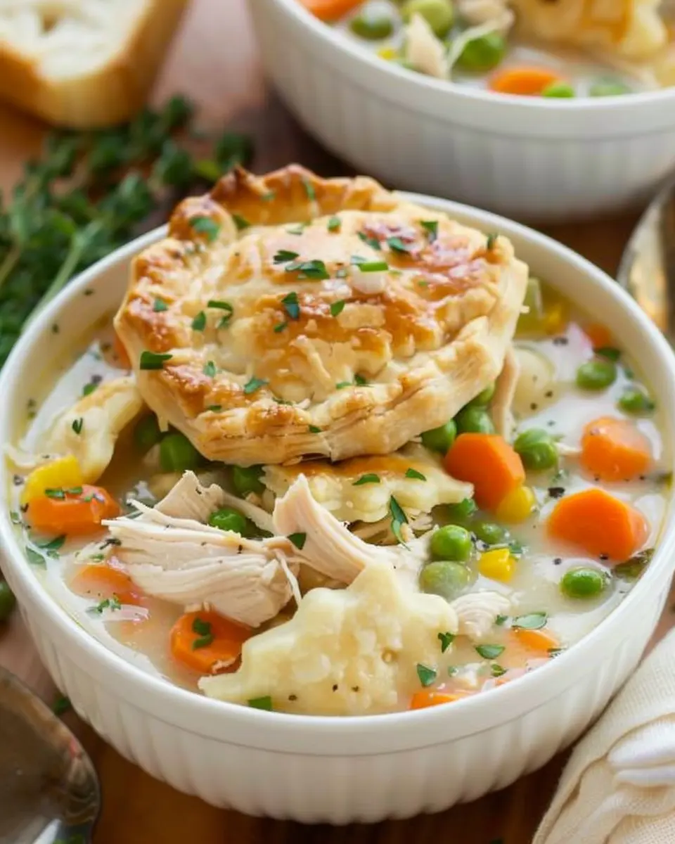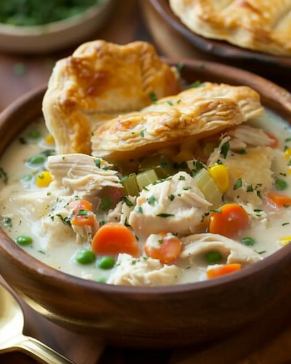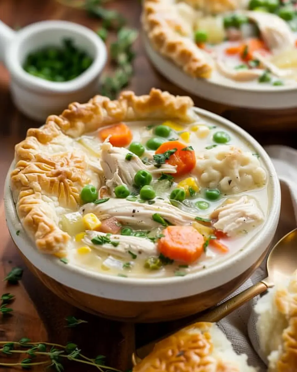 A warm and comforting soup that captures all the flavors of a classic chicken pot pie.