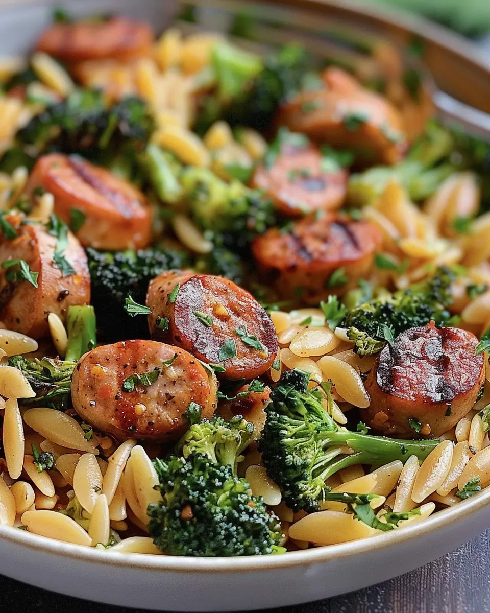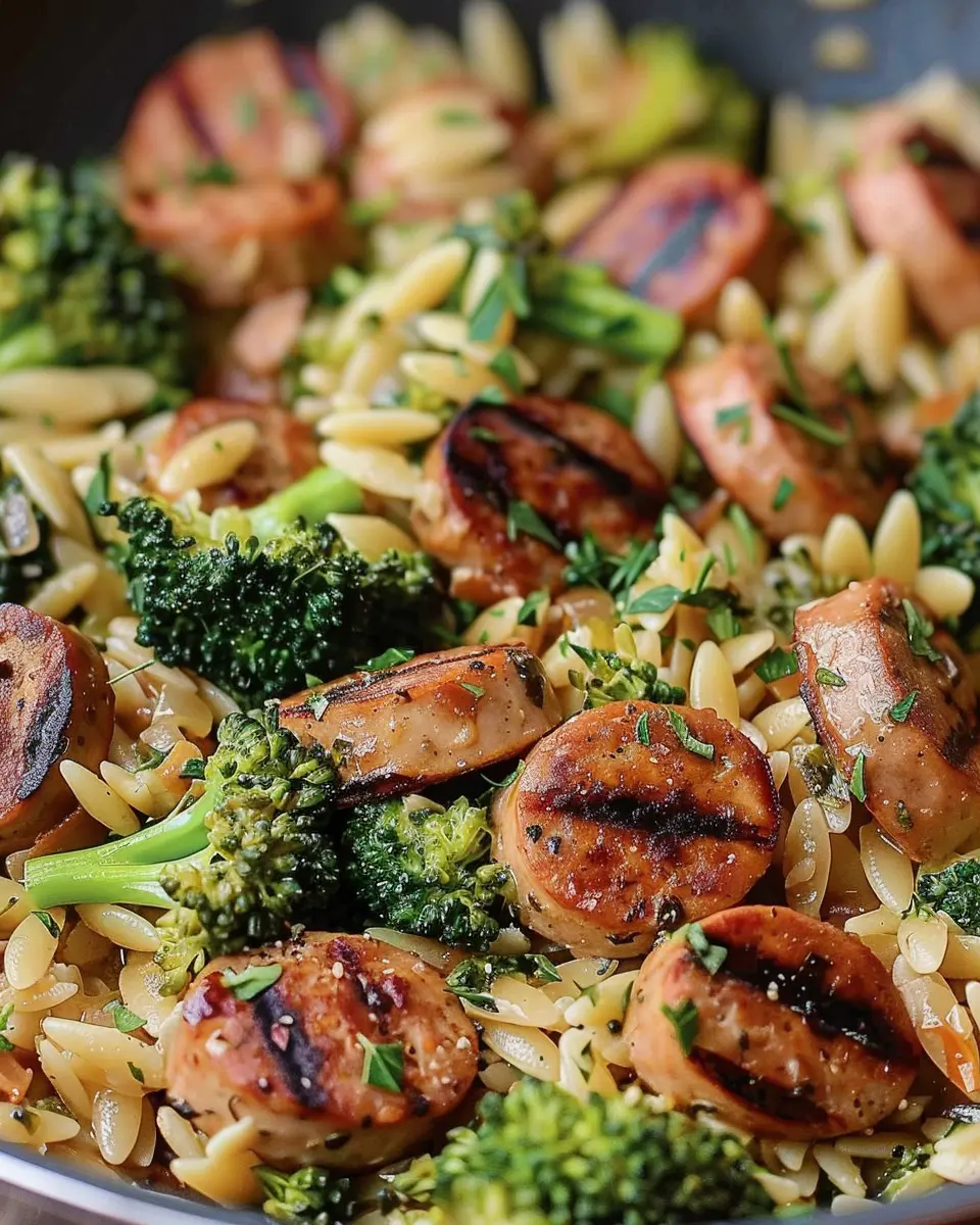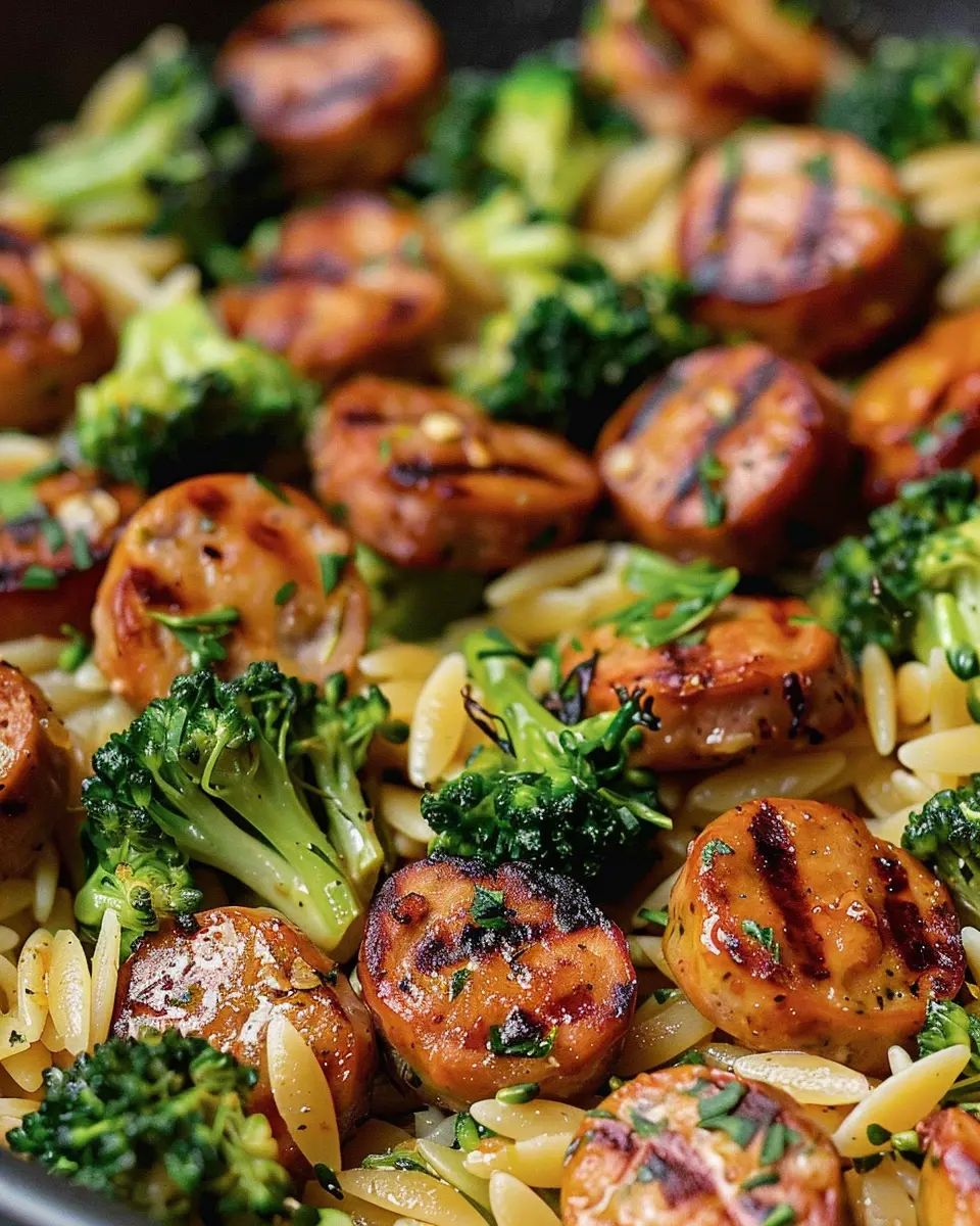 A delicious and nutritious meal featuring chicken sausage, broccoli, and orzo pasta.