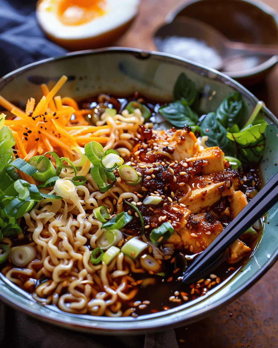Not feeling the meat? No problem! You can easily create a delicious vegetarian version of Chili Crisp Chicken Ramen. Simply replace the chicken with hearty ingredients like sautéed mushrooms, tofu, or tempeh. For an extra boost of flavor, use vegetable broth instead of chicken broth. Add some leafy greens like bok choy or spinach towards the end of cooking for a vibrant color and nutritious crunch.