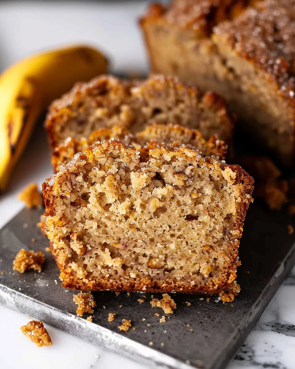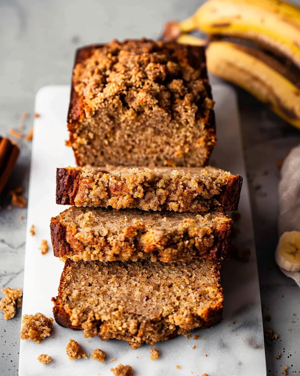 A delicious take on the classic banana bread recipe, featuring a crispy cinnamon crunch topping.