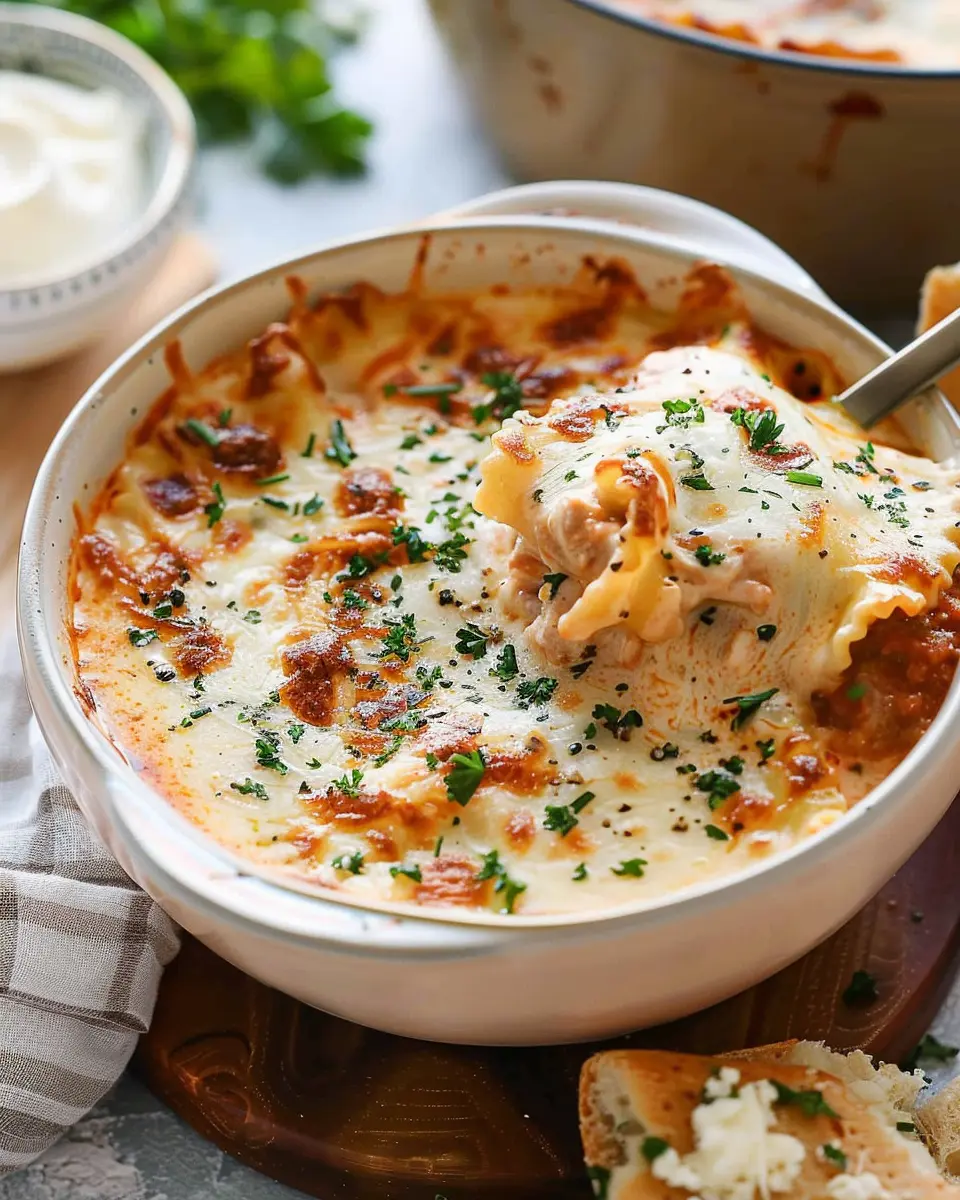 Elevate your creamy lasagna soup experience by getting creative with garnishes. Fresh herbs are a fantastic choice; a sprinkle of basil or parsley enhances the flavor and adds a pop of color. Want to take it a step further? Crumble some chicken ham on top for added protein and richness.