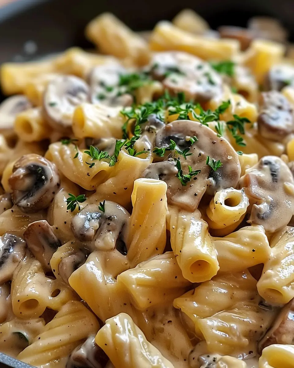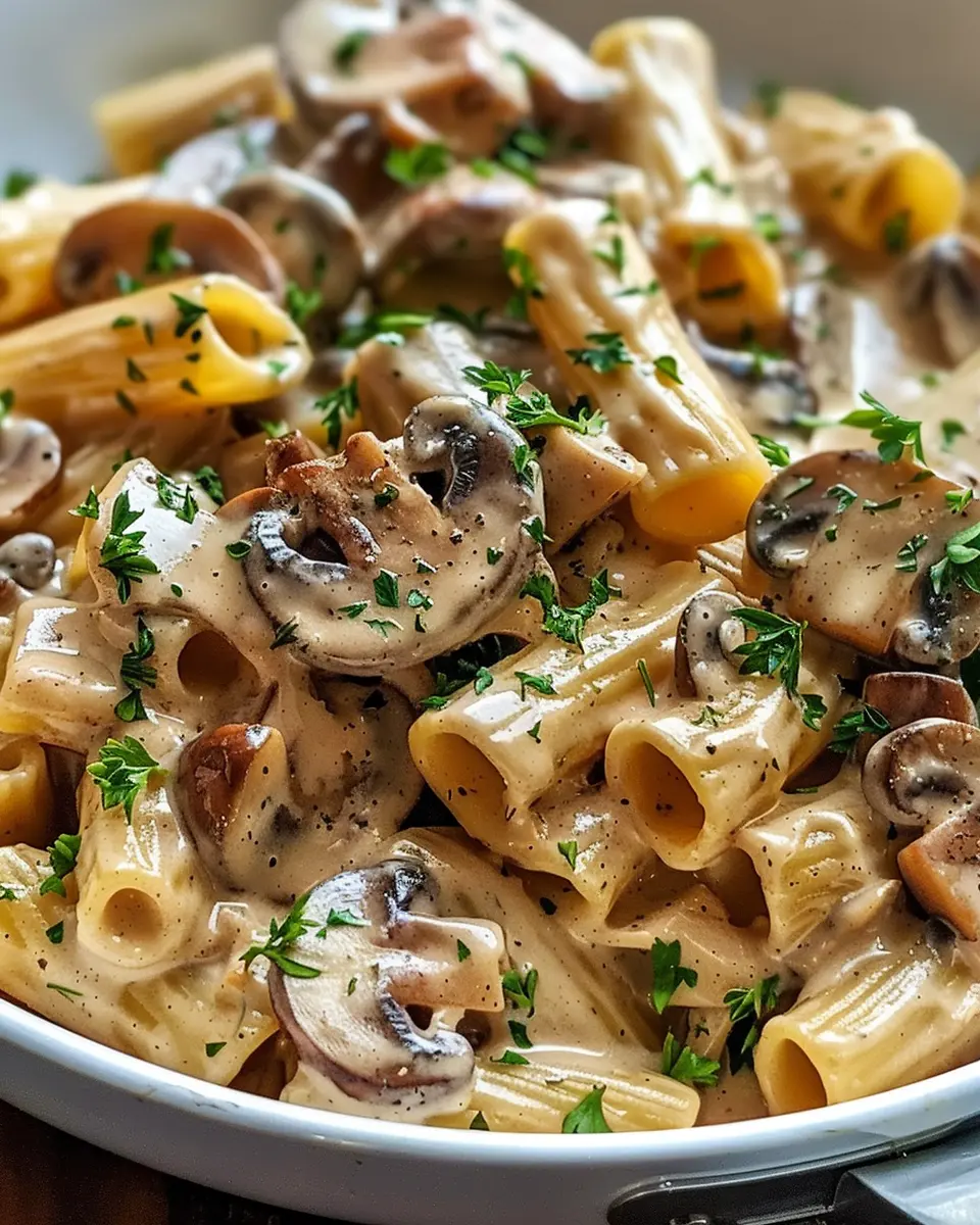 A delicious and creamy pasta dish featuring sautéed mushrooms and turkey bacon.