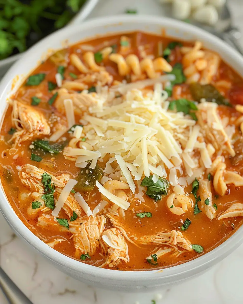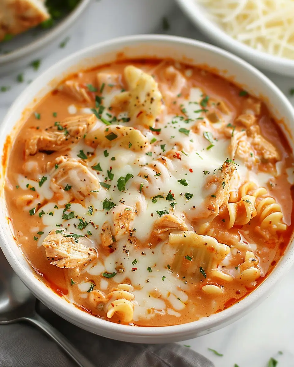 A warm and comforting bowl of Crockpot Chicken Parmesan Soup, perfect for chilly evenings.