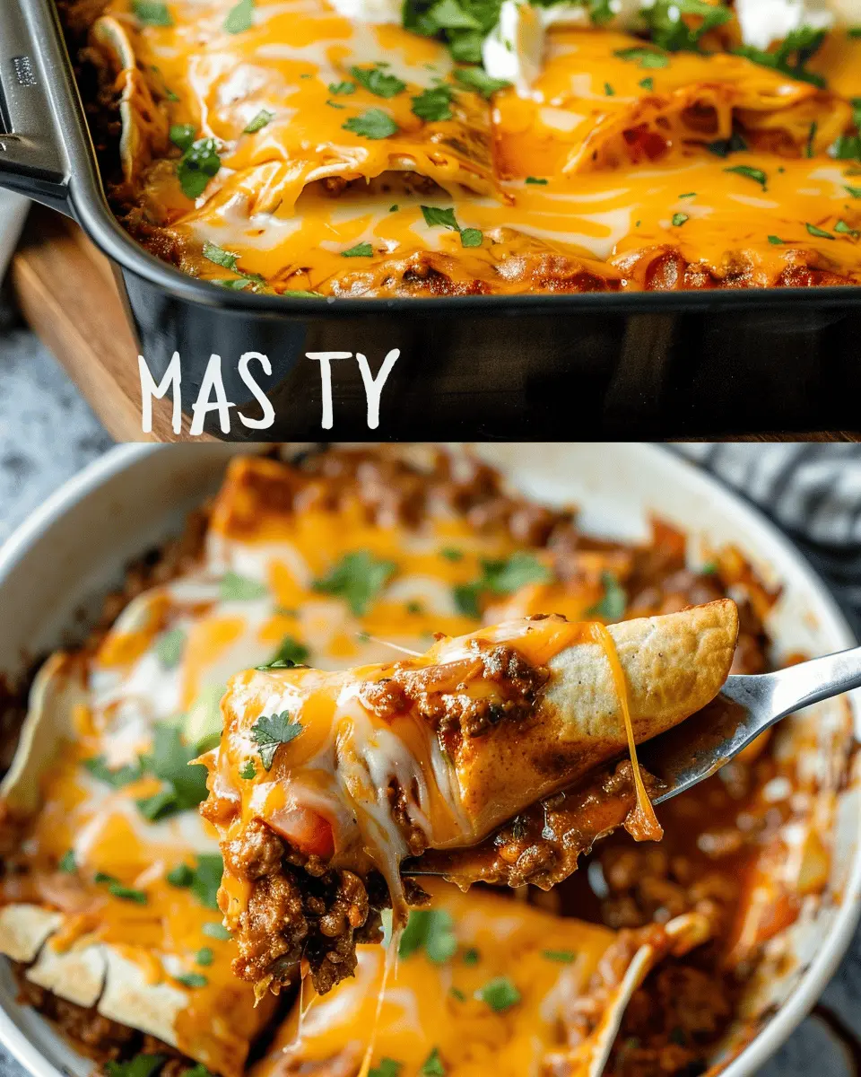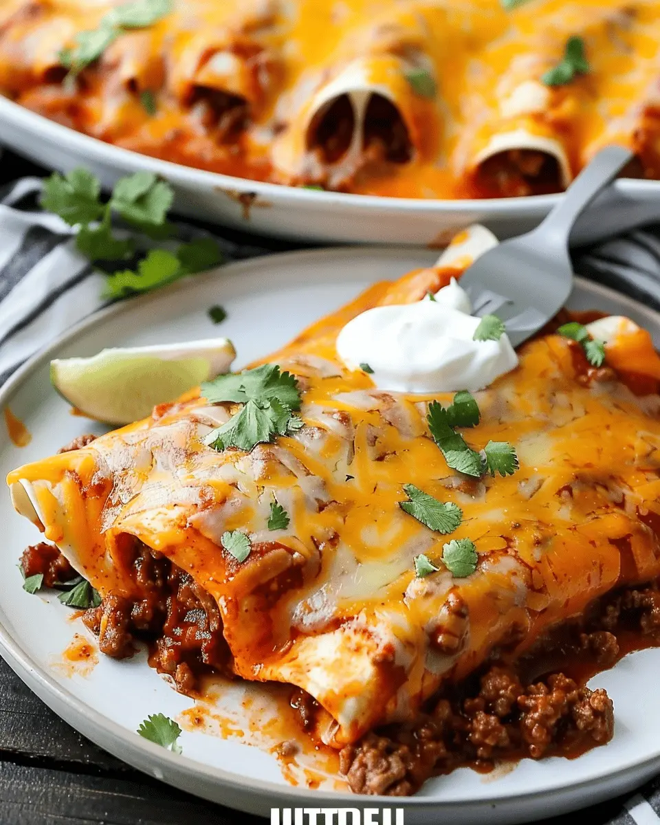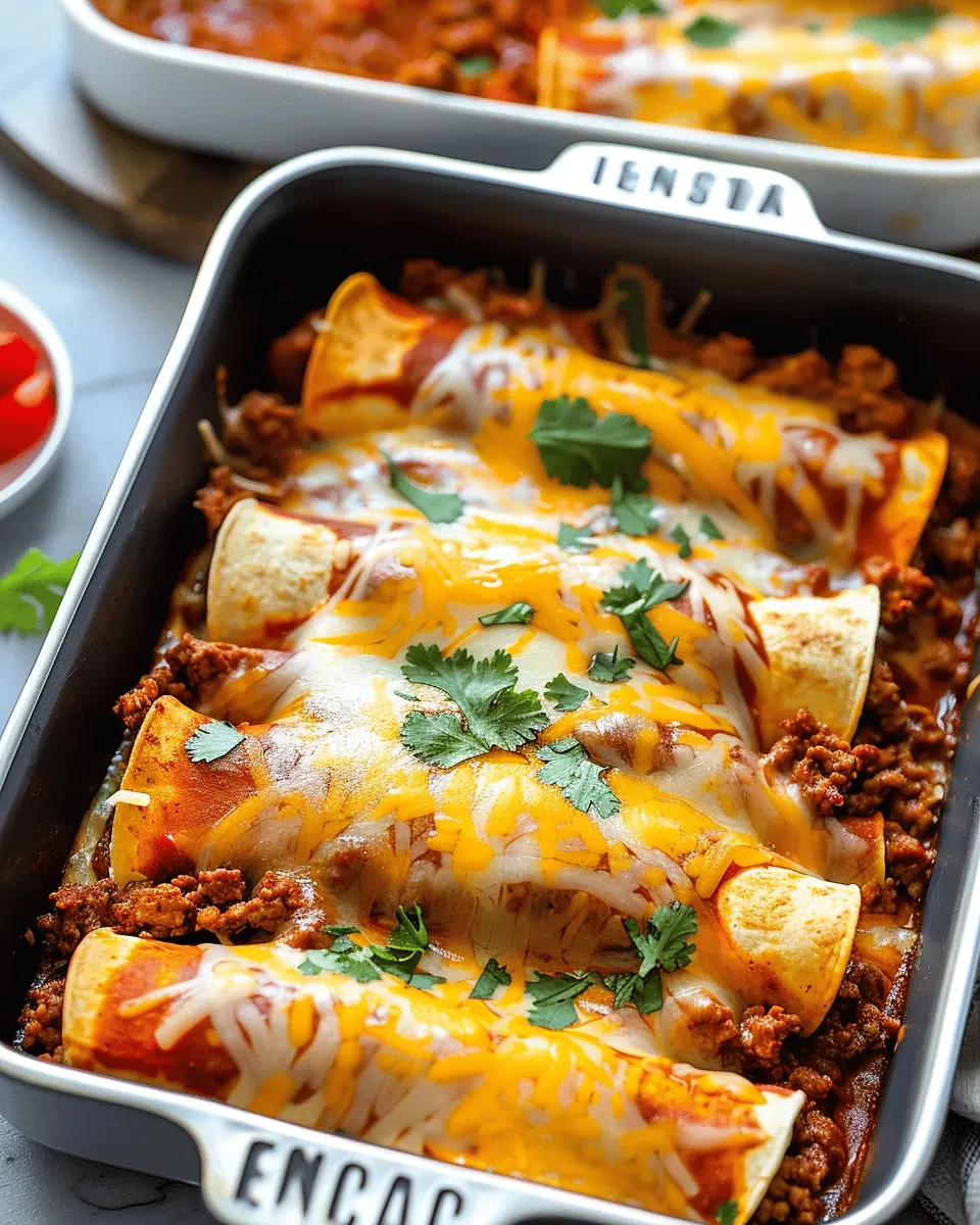 Quick and Easy: With just a handful of ingredients—ground beef, tortillas, cheese, and your favorite enchilada sauce—you can throw this dish together without needing to spend hours in the kitchen.