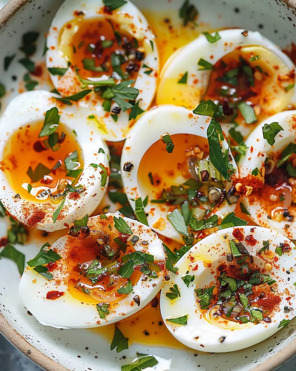Serving Suggestions: These jammy eggs are fantastic atop avocado toast, paired with turkey bacon or chicken ham. A side of garlic yogurt adds a cooling creaminess that perfectly balances the heat.