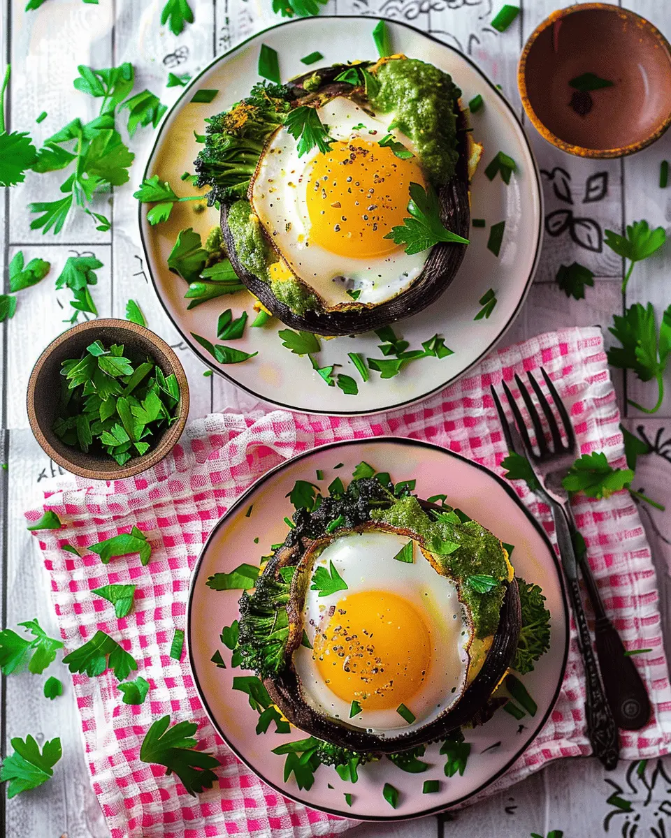 If you’re a fan of vibrant flavors, the Mediterranean-style version will surely become a new favorite. Start by mixing diced tomatoes, olives, and artichoke hearts with some Italian herbs. Spoon this savory mix into the portobello caps, crack an egg on top, and bake until the egg is set to your liking. The umami from the olives and the juicy tomatoes complement the mushrooms beautifully, creating a brunch dish that’s not just filling but bursting with flavors.