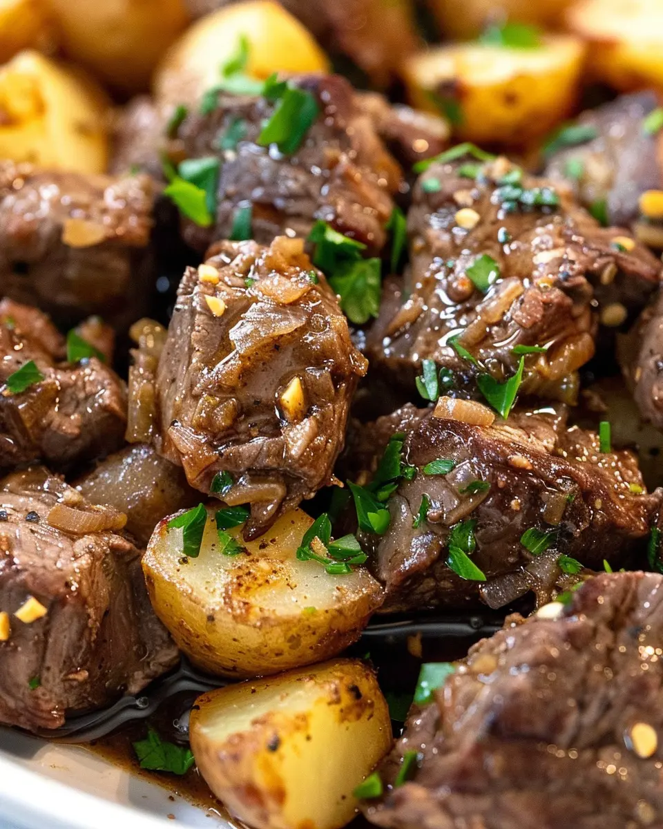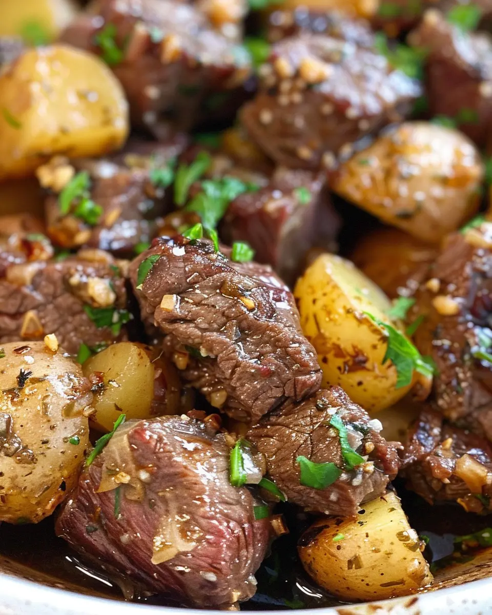 PrintSlow Cooker Garlic Butter Steak Bites and Potatoes Made Easy