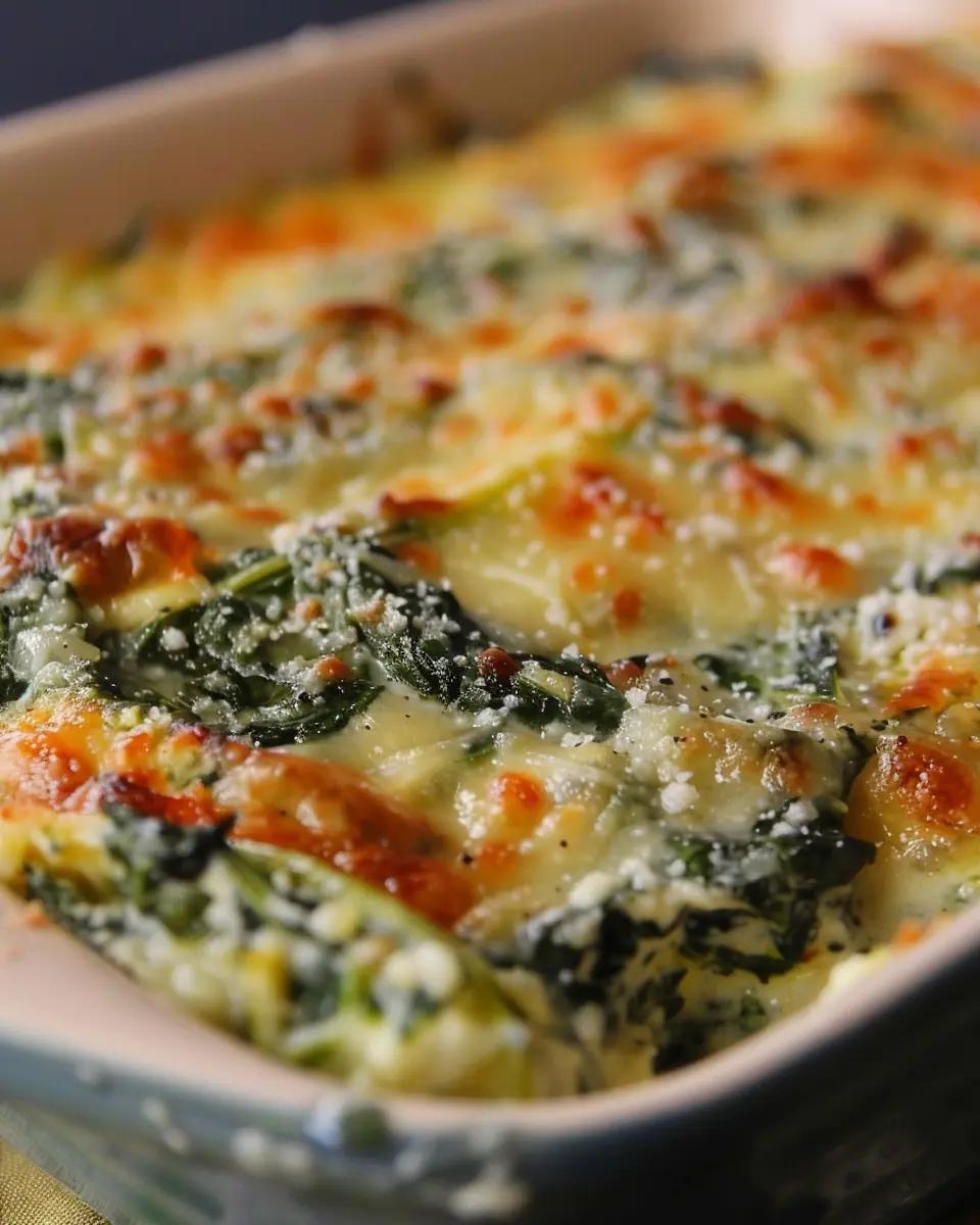 Finally, it’s assembly time! Layer the creamy spinach mixture evenly into your prepared baking dish. If you’d like, toss some turkey bacon or chicken ham into the mix for a savory kick, but this dish is equally scrumptious when kept meat-free.