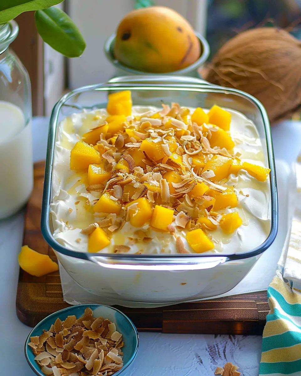 Keywords: Tropical Mango Coconut Trifle, No-Bake Dessert, Tropical Dessert