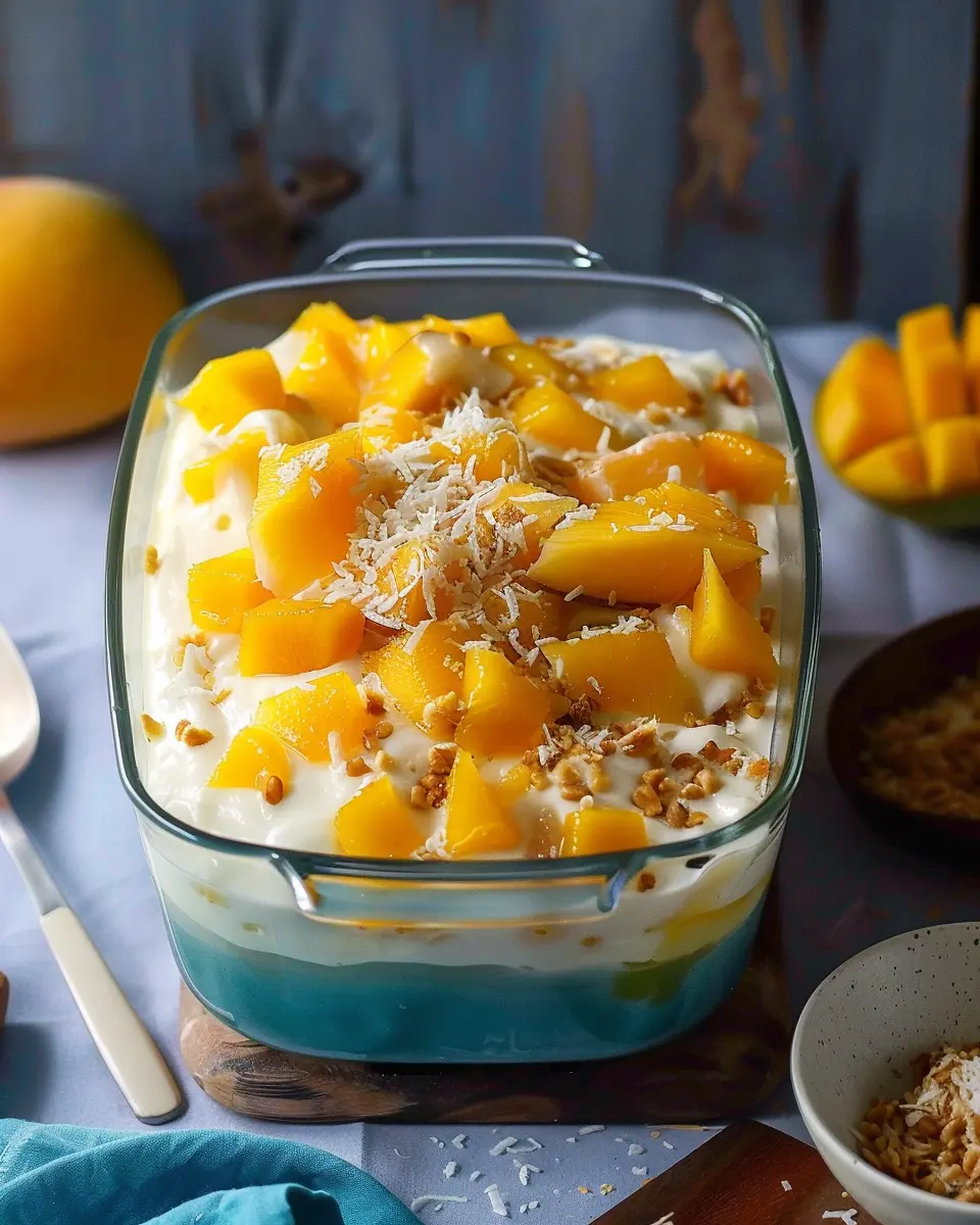 - In a trifle dish, layer half of the diced mango, followed by half of the coconut cream mixture.