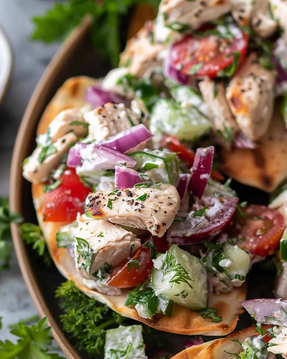 Shredding the chicken allows it to meld beautifully with the tzatziki sauce and other ingredients, ensuring a delightful bite with every forkful.