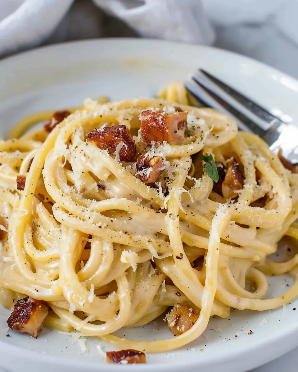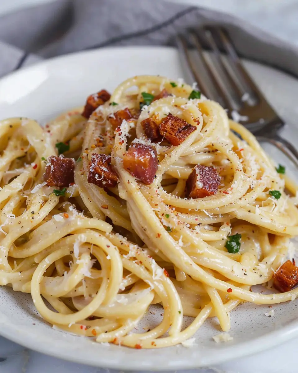 PrintVegan Carbonara: Indulgent Comfort with Turkey Bacon Twist