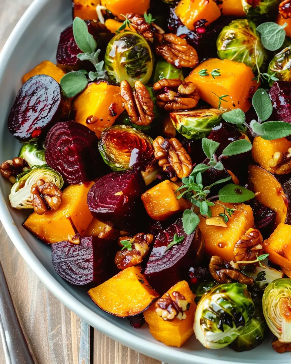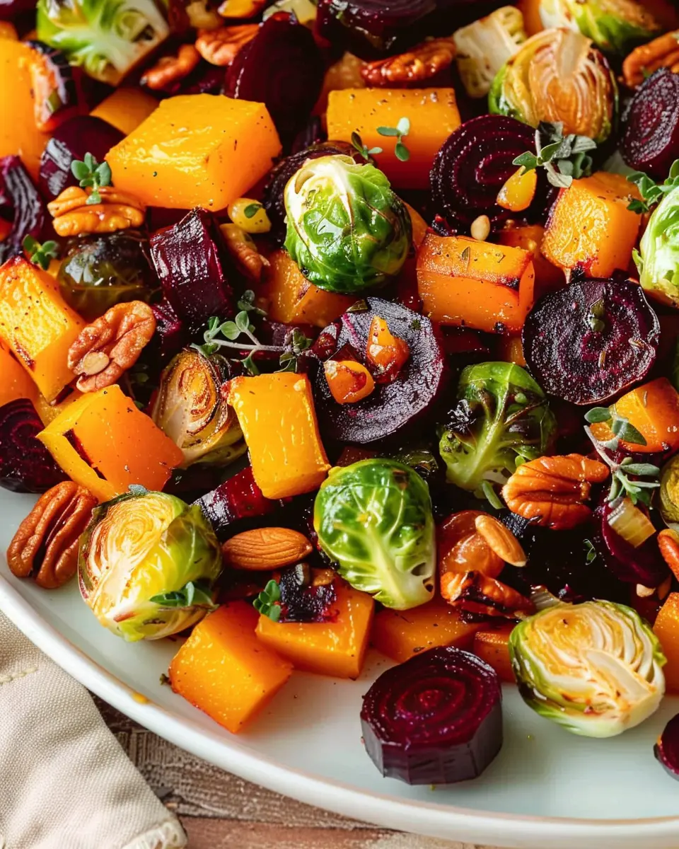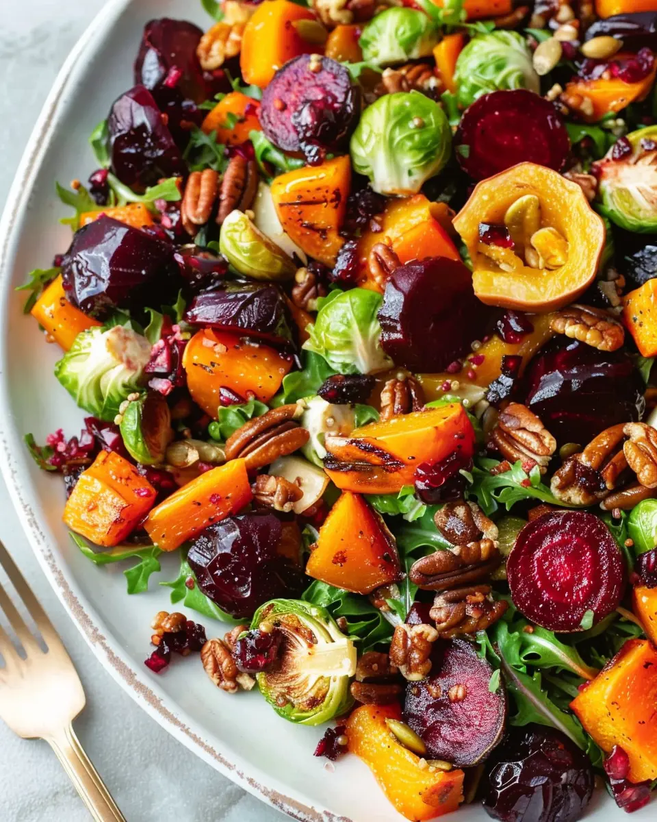 A delicious and hearty winter vegetable salad featuring roasted butternut squash, Brussels sprouts, and beets.